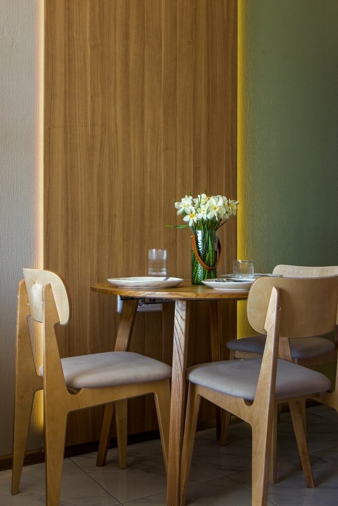 Освещение обеденной зоны также выполнили при помощи встроенной в панель подсветки.