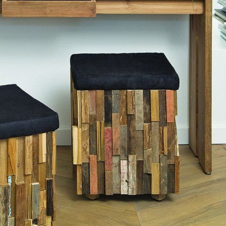 Оригинальный табурет из кусочков антикварного тика, сидение обтянуто козьим мехом черного или коричневого цвета.