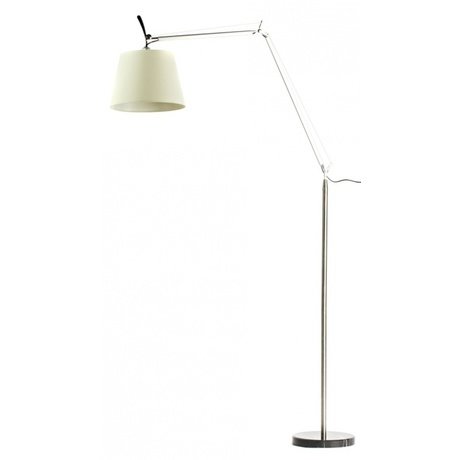 Элегантная и стильная напольная лампа обеспечит удобное настраиваемое освещение. Изящная ножка из шарниров и стоек позволяет регулировать высоту и угол падения света. Белый, слегка гофрированный тканевый плафон и лаконичное черное основание придают торшеру легкость и воздушность, делая его украшением интерьера.