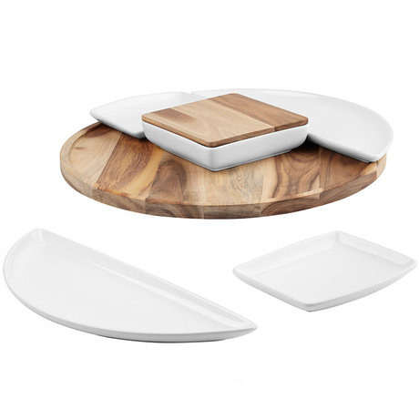 Эксклюзивная серия продуктов для дома, которые достойны королевского стола. Набор из пяти блюд, выполненных из высококачественной керамики, и подноса-основания из древесины акации. Каждая мисочка снимается и может быть использована отдельно. Центральная дополнена крышкой (также из акации). Поднос вращается, что обеспечивает удобство сервировки на столе, за которым находится большое количество гостей. Великолепное решение для любого торжества!