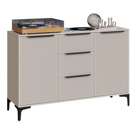 - Вместительность — две распашные двери и три выдвижных ящика для одежды, белья или аксессуаров- Рифленые фасады — добавляют объемную текстуру и визуальный интерес без перегруженности деталями- Универсальный дизайн — подходит для спальни, гостиной, прихожей или детской комнатыКомод идеален для квартир и домов в скандинавском или современном стиле. Нейтральный оттенок кашемира легко вписывается в любую цветовую гамму. Благодаря ширине 128,9 см и глубине 40,3 см модель подходит даже для небольших пространств, обеспечивая достаточно места для хранения.Технические характеристики: