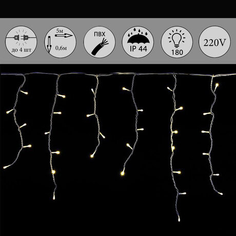Название: | A-056R WW светодиодная гирлянда "бахрома" 5x0.6м 180LED белый провод влагозащищен. |