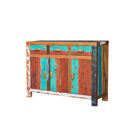 Комод, выполненный из массива древесины старого рыбацкого судна, такой как: тик, махогон, суар, с сохранением оригинальной многослойной окраски.