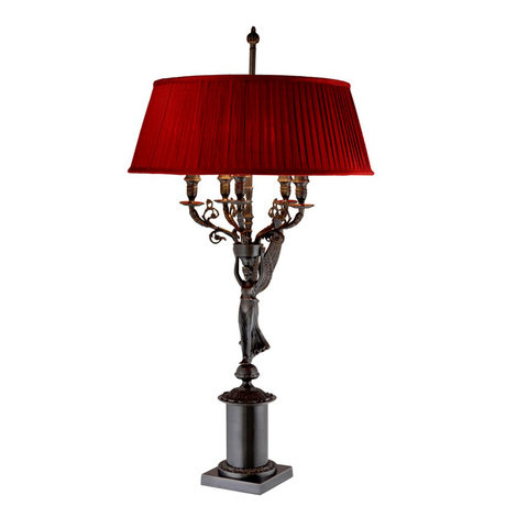 Настольная лампа Table Lamp Goddess на основании с оригинальным дизайном из металла цвета черно-коричневая бронза. Текстильный абажур красного цвета скрывает 5 ламп.