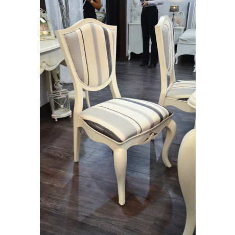 Стул с фигурной спинкой выполнен в классическом стиле. Отделка молочно-белый матовый лак. Сиденье и спинка обиты тканью в полоску из ассортимента фабрики. Передние ножки гнутые, задние прямые под углом. Сделан из массива дерева.